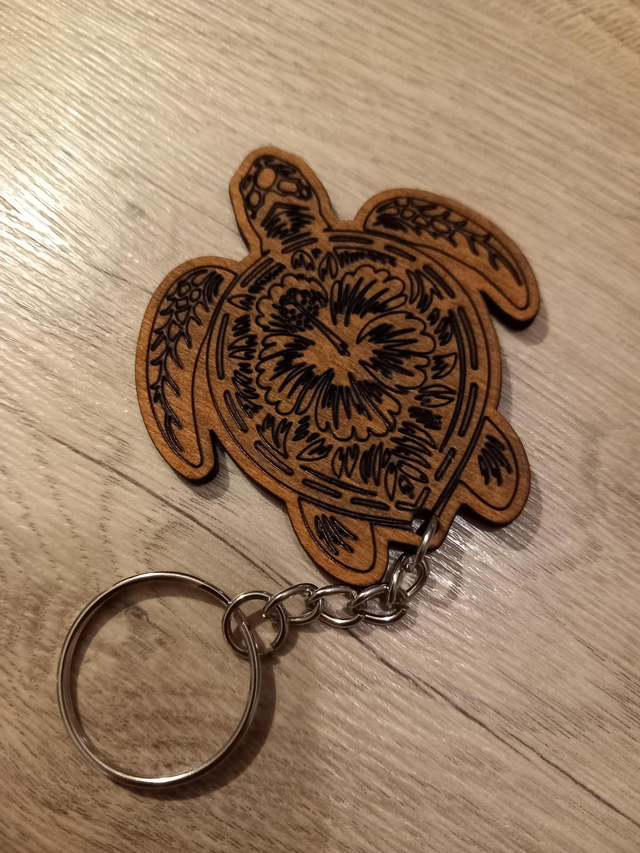 Porte clé en bois découpé au laser, "tortue marine", finement gravé au laser.
